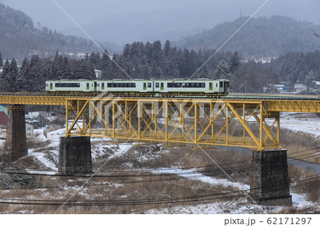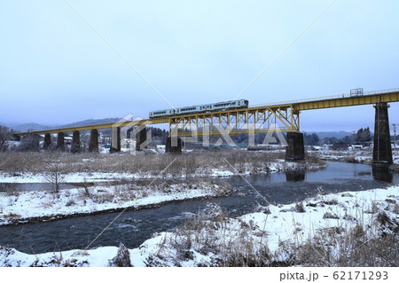 冬の一ノ戸川橋梁を渡るキハ110系気動車