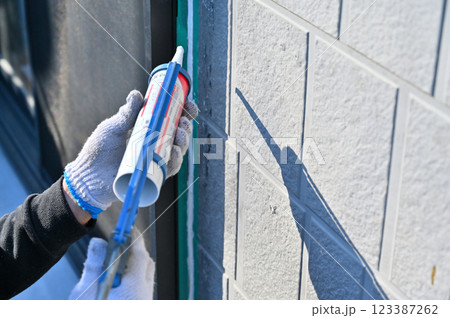 ヘラでコーキングをならす職人 外壁塗装工事 コーキング打ち替え