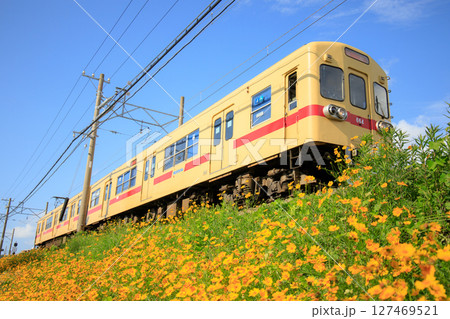 オオキンケイギクと西鉄600形電車(西日本鉄道)