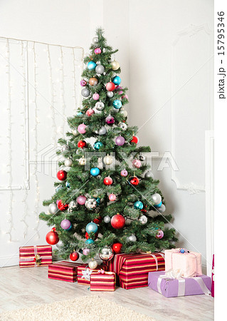 クリスマスの背景イラスト素材 キラキラとモミの木の枝(1_2) オーナメント有 レッド背景