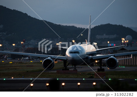 夕暮れの到着便 ボーイング777の到着機 斜めに到着