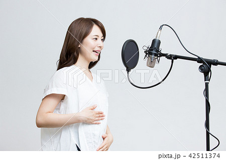 若い女性(白バック、ボーカル、マイク、録音、コンデンサーマイク