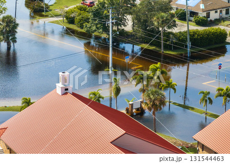 Flooding in Florida caused by tropical storm from hurricane rainfall. Suburb houses in residential community surrounded by flood waters. Aftermath of natural disaster