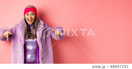 Fashion and shopping concept. Happy korean senior woman pointing fingers down and showing awesome promo deal, wearing trendy purple fur coat and headband, pink background