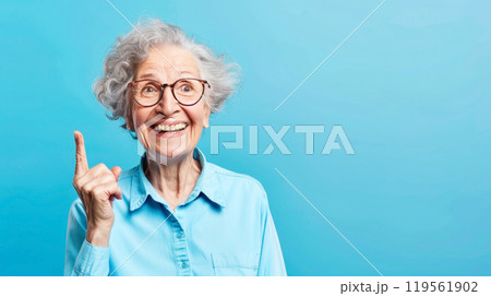 An elderly man wearing glasses and a checkered shirt smiles widely while pointing playfully. His warm expression radiates joy set against a vibrant yellow backdrop.