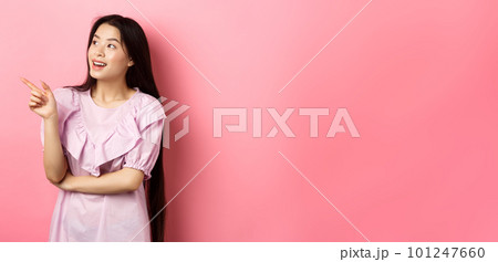 Excited smiling asian woman in dress, pointing and looking left at logo, checking out promotion, standing on pink background