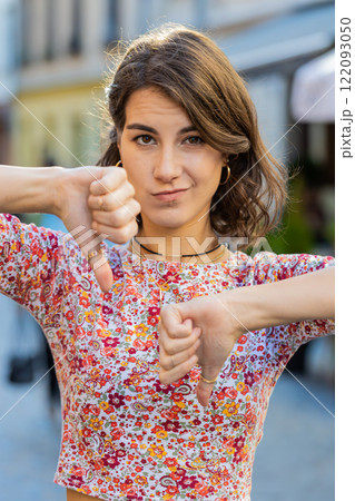 Upset young woman showing thumbs down sign, disapproval, dissatisfied bad work, mistake in city