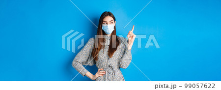 Healthy people and covid-19 pandemic concept. Curious girl in medical mask pointing at upper left corner, standing on blue background