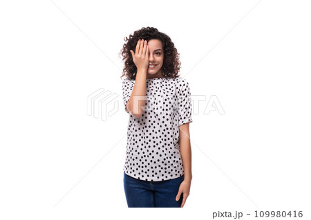 young stylish woman with curly hair dressed in a blouse with polka dots smiles and feels happy