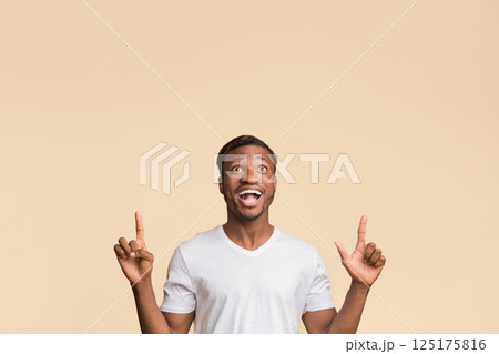 Look Up. African American Millennial Guy Pointing Fingers Upward In Excitement Standing Over Yellow Studio Background. Empty Spacce For Text