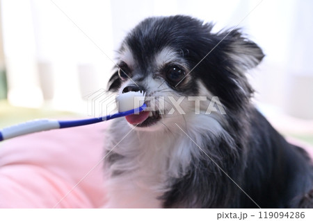 ハミガキをする犬 ロングコートチワワ