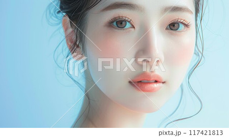 Elegant and tender young woman, mermaid draped in sheer fabric standing in glowing blue light, embodying ocean magic