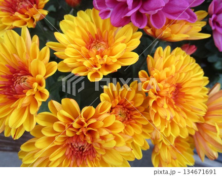 秋の庭に咲く黄色いポットマム(洋菊)の花