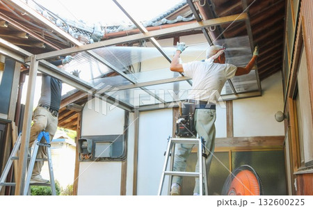 ポリカ波板を大工2人で屋根に設置するため持ち上げている