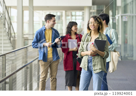 施設を歩く多国籍の学生グループ
