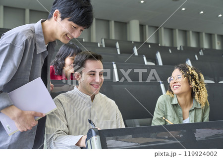 教室で会話する多国籍学生のグループ