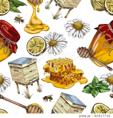 Apiary and beekeeping seamless pattern in colored sketch style - vector illustration on white background.