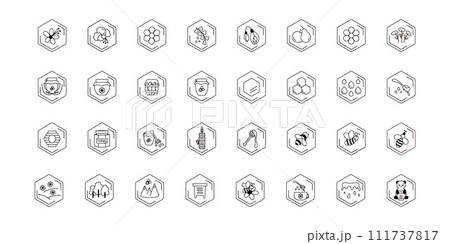 Honey icon set vector. Bee, flower, honey jar, spoon, bear, bee hive. Beekeeping products, symbols.