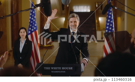 Confident US minister or congressman smiles, poses for cameras after political speech