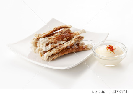 白背景にお皿に載せた鮭皮のチップス