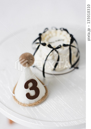 A small birthday cake with black ribbons and a party hat with the number 3 on it.