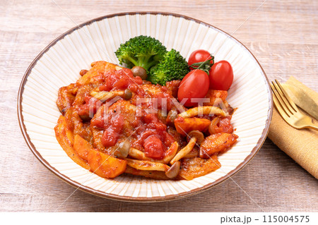 spaghetti dressing fried chop pork and slice tomato in ketchup sauce on plate