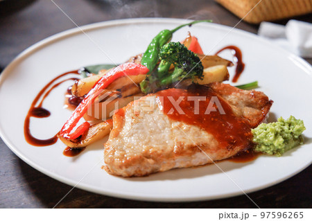 厚切りポークステーキ、トンテキ。豚肉のステーキ。生姜焼き。洋食イメージ。