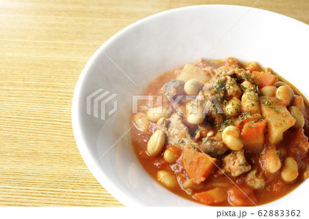 注意)湯気はレタッチ合成。蒸し大豆を使ったポークビーンズ(大豆と豚肉のトマトスープ)です。
