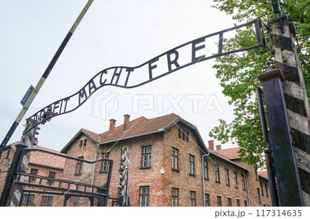 アウシュビッツ収容所の門の前