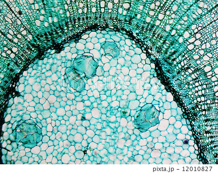 Zea stem, maize stem, cross section, 20X light micrograph. Stem of the plant Zea mays, under the light microscope. Ten individual shots combined into one overall picture. Isolated on white background.