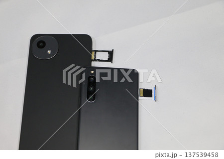 SIM card holders, a spare part for a tablet phone, on a white background, a collage view from two sides