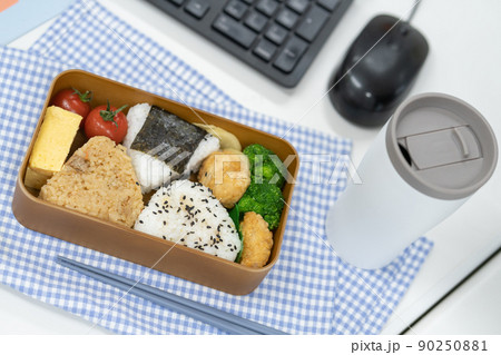 パソコンの前に置かれたおにぎり弁当とマイ箸