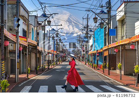 Woman walking on the road in Fujiyoshida with background of Fuji mountain, Japan.