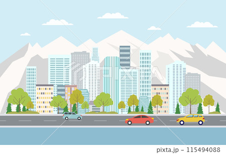 Flat Design Illustration of Cityscape Building with Lake River and Car in Road Traffic on Sunny Day