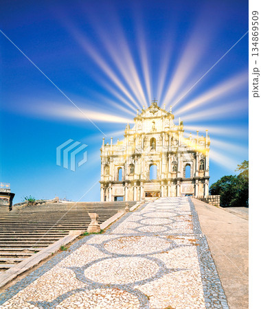 世界遺産に登録されたマカオ歴史市街地区の聖ポール天主堂跡のファサード