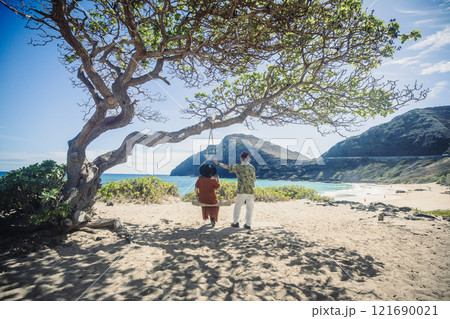 ハワイ東海岸の海辺で、木の下のブランコから海を眺める老夫婦