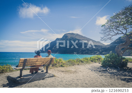 ハワイ東海岸の海辺のベンチから海を眺める老夫婦