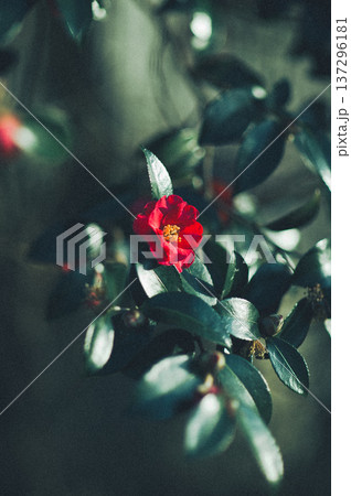 雨露のサザンカの花 クローズアップ|自然背景・フィルム写真デジタル化