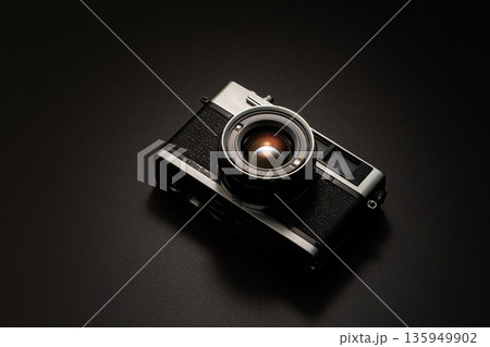 暗い背景にスポットライトが当たった古いフィルムカメラ
