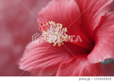 Pink hibiscus flower close up with stamen and soft petals conveying delicate beauty and gentle emotion