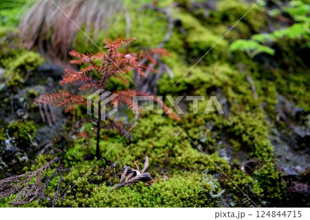 苔むした地面に根付く小さな赤い若木