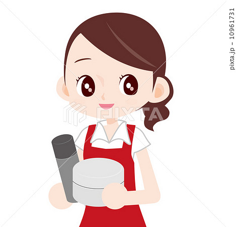 お弁当箱と水筒を持ったエプロン主婦