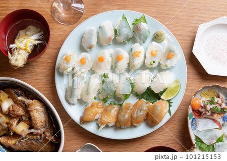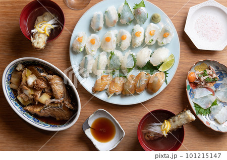 マゴチづくしの食卓(薄造り、昆布締め、握り、塩焼き、あら汁)