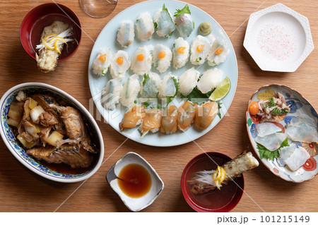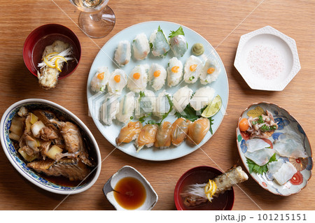 マゴチづくしの食卓(薄造り、昆布締め、握り、塩焼き、あら汁)