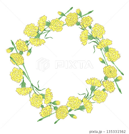 母の日の黄色カーネーションの手書き風カラーイラスト素材(フレーム・リース・花束など)