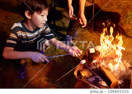 焚き火でマシュマロを炙る小学生の男の子 ファミリーキャンプ イメージ