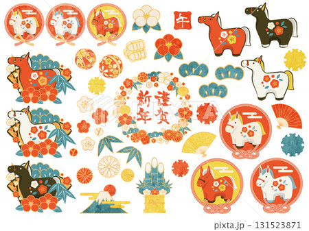 午年年賀状アイコンセット、レトロカラー、イラスト、かわいい、お正月