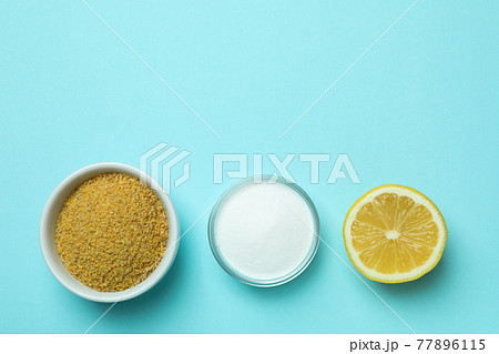 Bowls with mustard powder and acid powder, and half of lemon on blue background