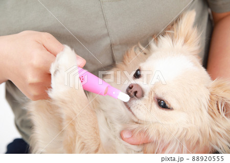飼い主の膝の上で歯を磨かれるクリーム色のロングコートチワワ