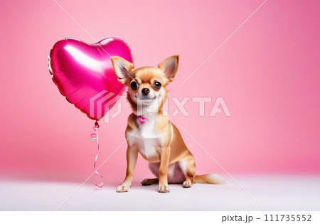 Charming puppy chihuahua with pink heart shaped balloon on a solid color background. Banner, copy space for text. Valentine's Day Gift. Funny Valentines animal, love, wedding. Greeting card, postcard